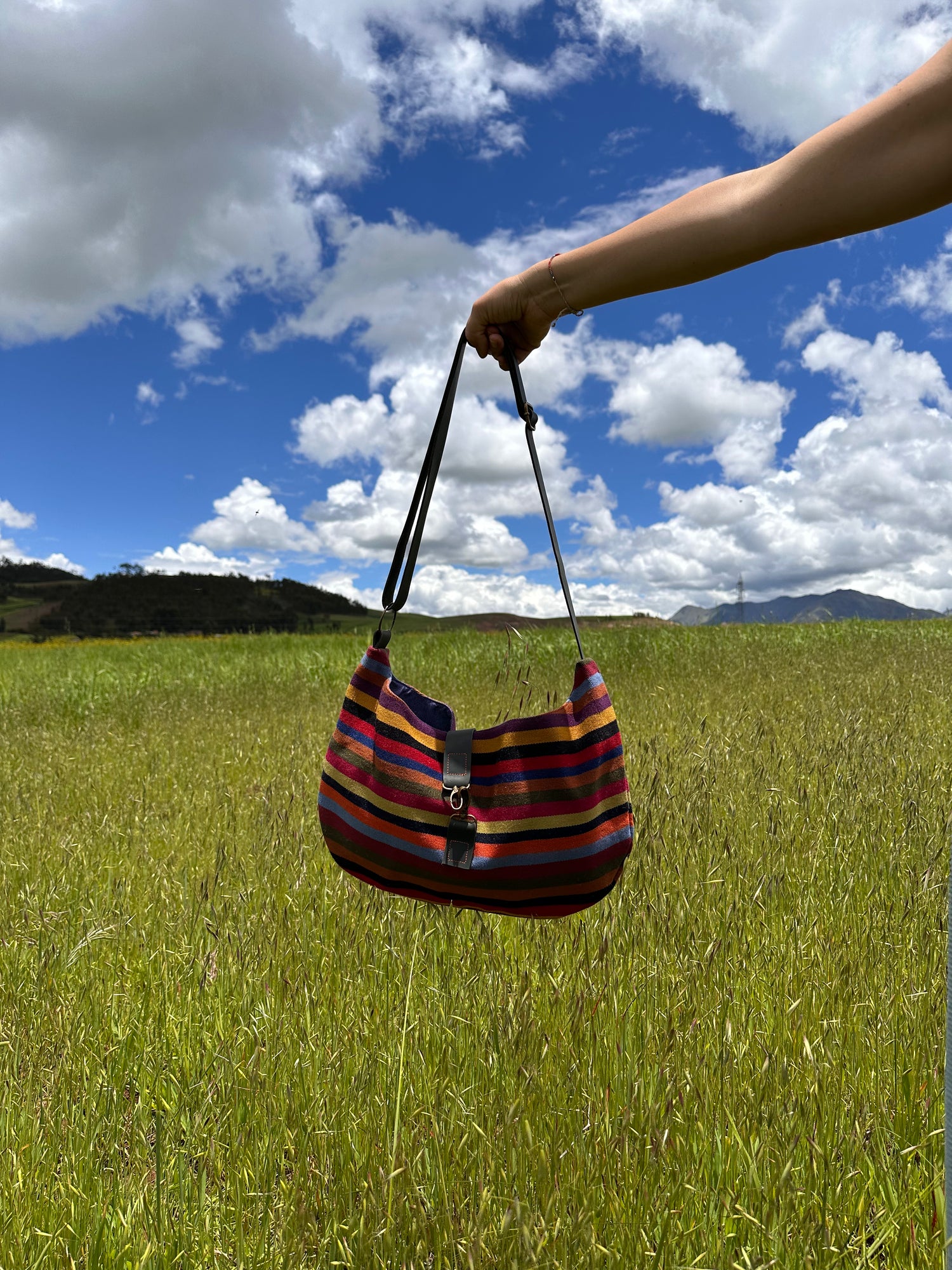 Nuestra "AtyQ'all bag Media Luna" con tonos cálidos y vibrantes, evoca la esencia de los paisajes andinos. La combinación audaz, pero equilibrada de rojos profundos, marrones terrosos, amarillos mostaza y toques de azul, reflejan la riqueza del arte textil de Cusco.